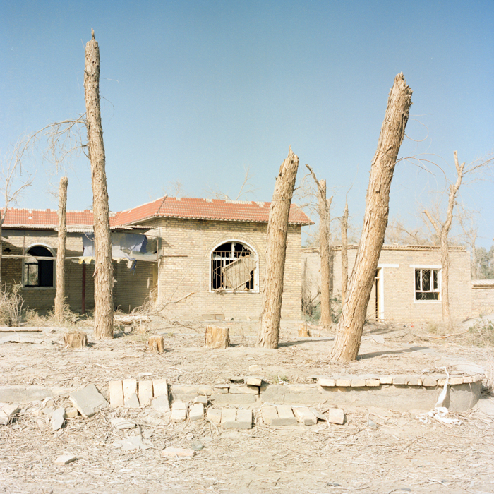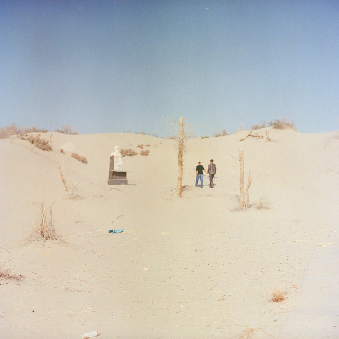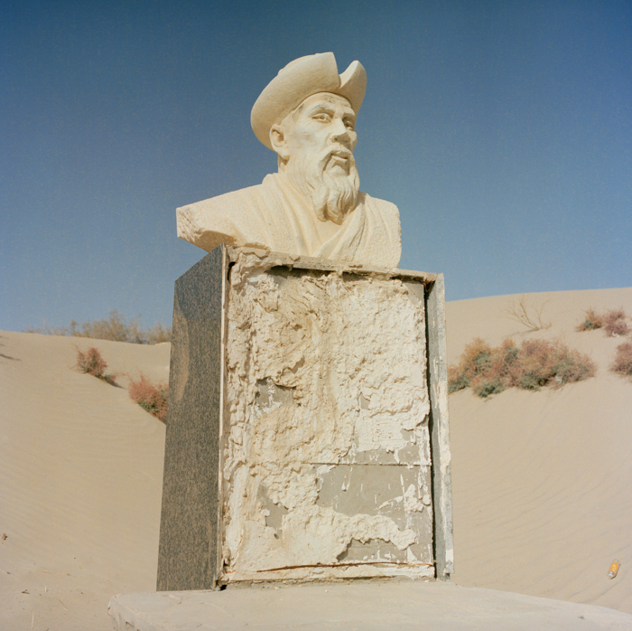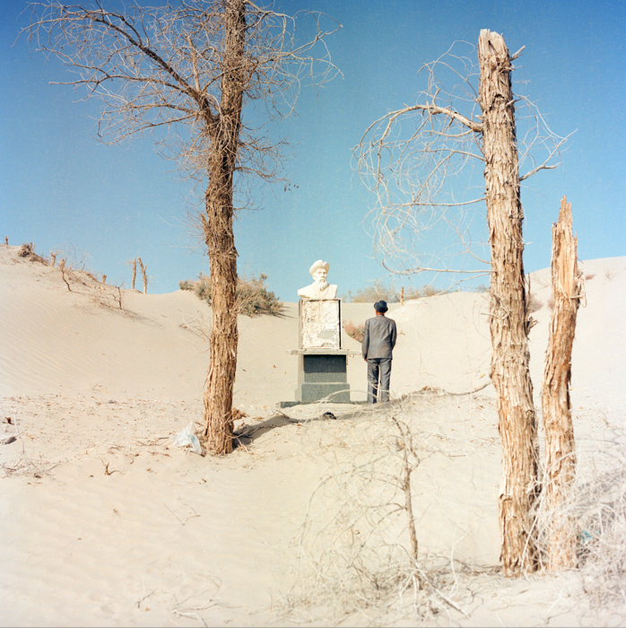 野鸭子“奥尔德克。” 而塑像面前的几棵胡杨树枯干,