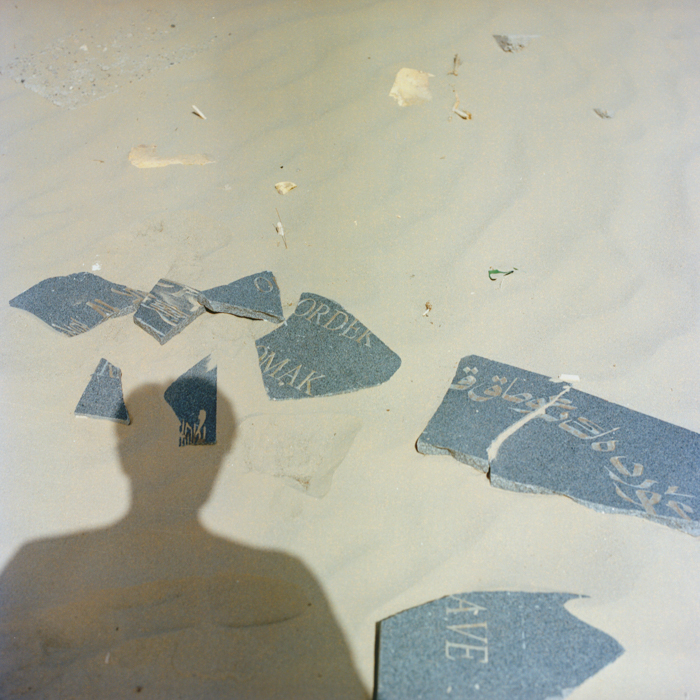 正面刻字的大理石板已经在碑前沙地上碎成了数块。
